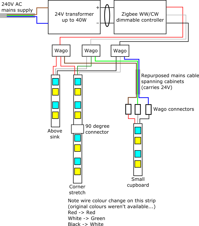 Here’s the wiring diagram I posted on top of the cabinets next to the wiring for my installation. Nothing’s perfect, so I left the warts unhidden here: I ran out of black/red/white three-core cable so had to switch colours partway through, and I also re-used a mains cable as a 24V supply since I couldn’t re-pull more obvious cables through and felt that buying a separate transformer and controller just to avoid this wasn’t worth it.